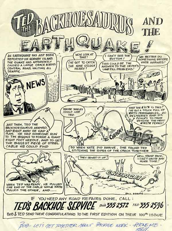 After I quit the highways job I worked Dave Colley’s backhoe for a couple of years. Then I ran Ted Wadland’s machine for quite a while. I began advertising in the First Edition using some skills I’d learned in a former life. Anybody out there remember Letraset?