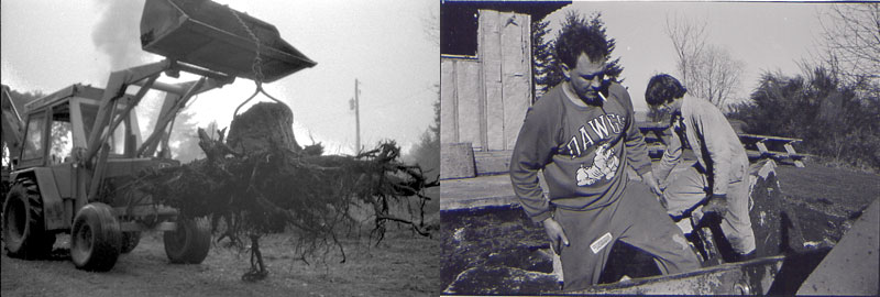 The closest I ever came to killing somebody was when I was clearing land for Hugh MacDonald. Sitting in the cab you have to keep track of onlookers. All that metal swinging around could make a real mess out of a person. The most common danger point was when I dug wells. People are drawn to the edge of the hole to watch the bucket do it’s work. More than once I had to gently nudge people away from the swing zone. One little twitch of the control and you could send a client into the next dimension. Bad for business. I was pushing a tree onto the burn pile. Hugh had gone out of sight. He was working by hand on the other side of the fire. The top of the tree came over the pile and gave him a mighty whack. Next thing I know there’s Hugh , covered in blood, crawling up the side of the machine trying to get my attention. When he got to emergency it was discovered he had a burst spleen. He came out alright, he lived. Phew!